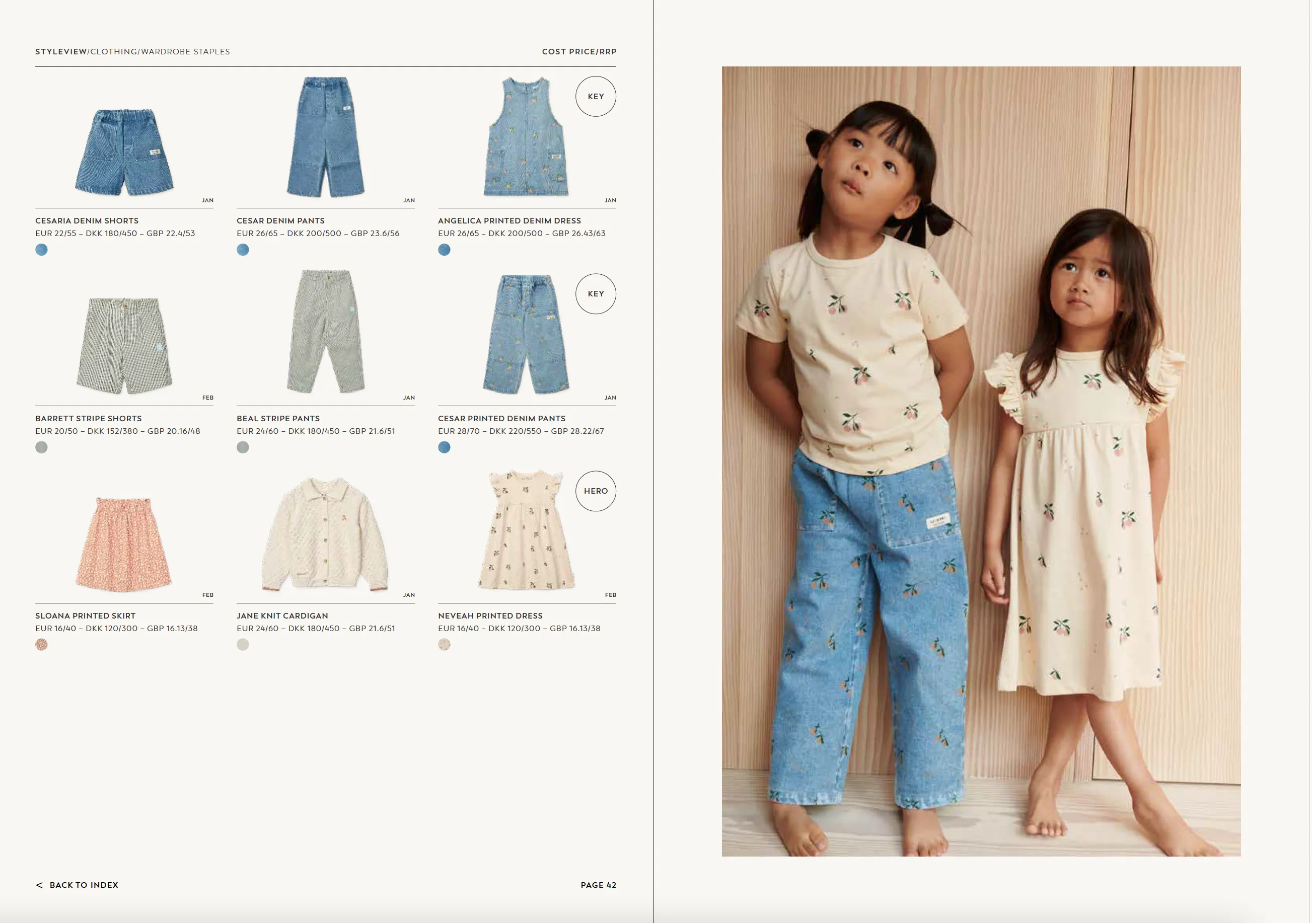 The Liewood collections was strategically built to align with business objectives while maintaining a strong visual identity. The structure balances core, commercial, and bestseller pieces with image items and novelty products, ensuring a well-rounded offering. Each piece was selected to complement the others, creating a cohesive range that resonates with diverse customer segments. The mix of products was designed to meet market demand, highlight the brand's vision, and drive both creative and commercial success.