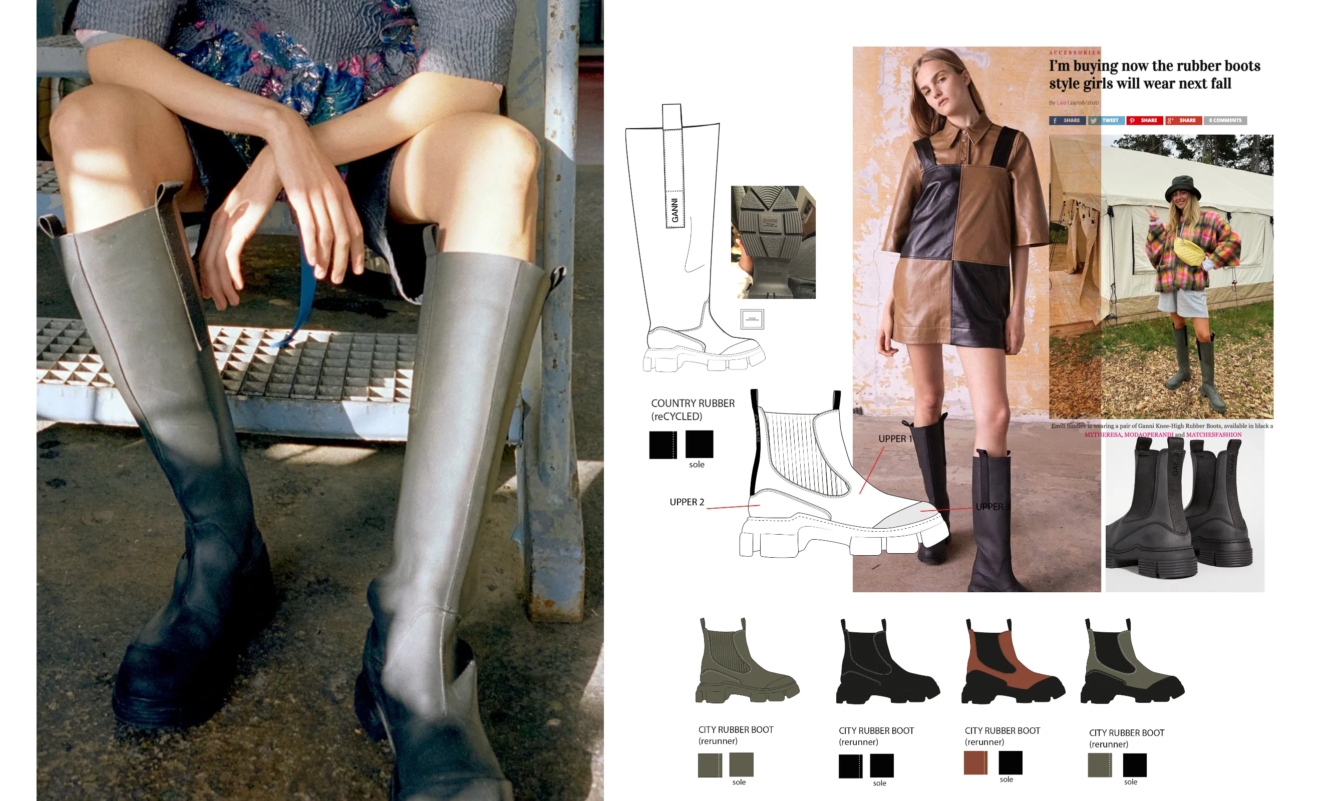 RECYCLED RUBBER BOOT. Driven by a vision to create iconic, long-lasting footwear, this project focused on material innovation, reimagining classic rain boot silhouettes through a sustainable lens. Designed to withstand both time and the elements, the Chelsea and high-shaft styles were crafted from recycled natural rubber, offering a low-impact alternative without compromising on functionality. A custom-developed outsole with enhanced grip for wet conditions, while a shared last across styles ensures a cohesive, streamlined fit. Produced in Europe, the result was a modern, minimal boot with understated appeal—a favourite among style-conscious consumers and influencers worldwide.